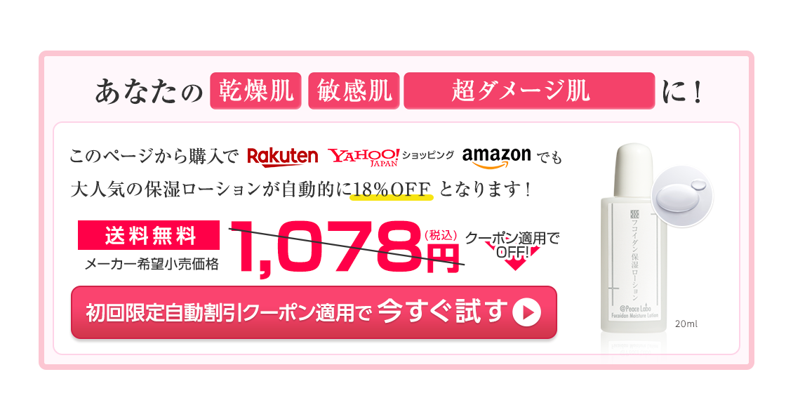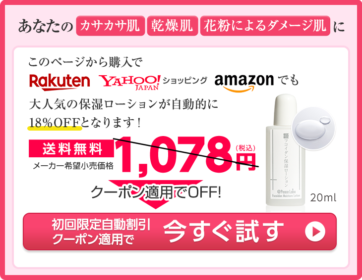 - フコイダン保湿ローションには、ヨードは含まれておりません。 本品へ使用しているのは、高分子フコイダンです。純度の高いものにするために精製を行う過程で、低分子を除去する製法になっており、 分子量が10,000以下のものは除去しております。そのため、分子量の低いヨードは、精製の段階で除去されております。
