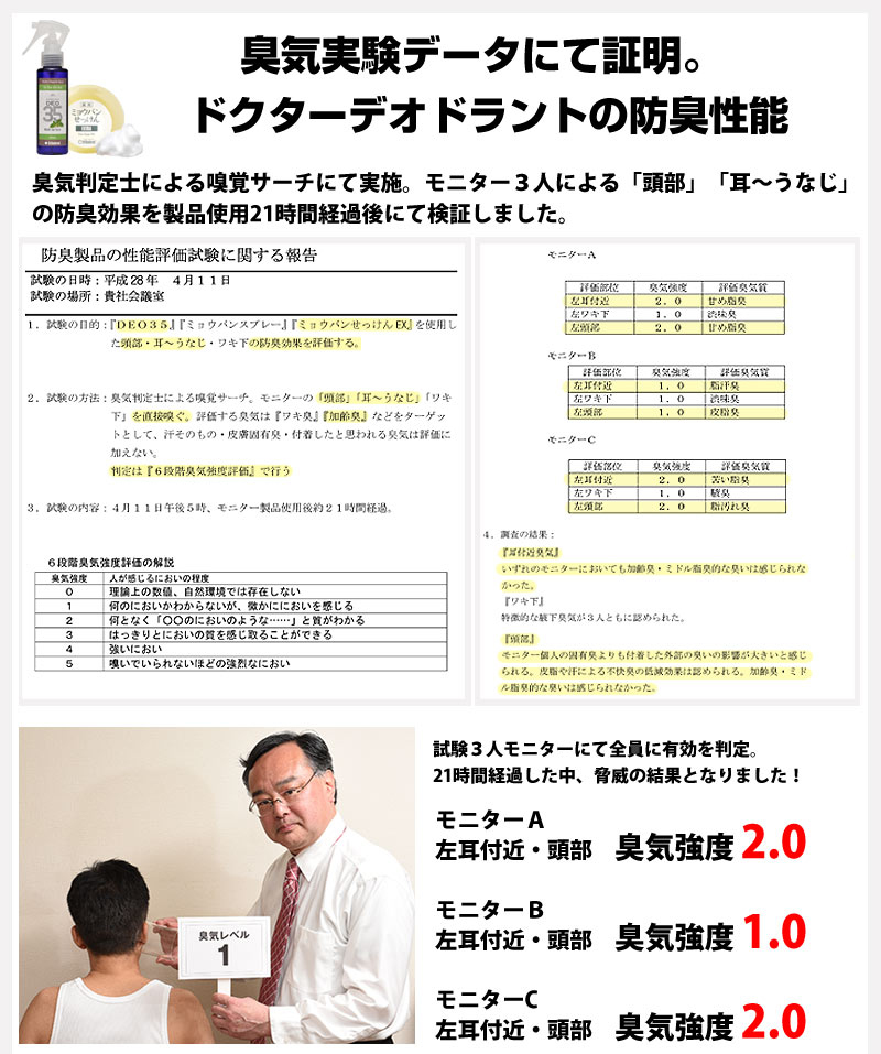 臭気判定士による嗅覚サーチ試験でも実証済み。モニター3名全員がほぼ無臭