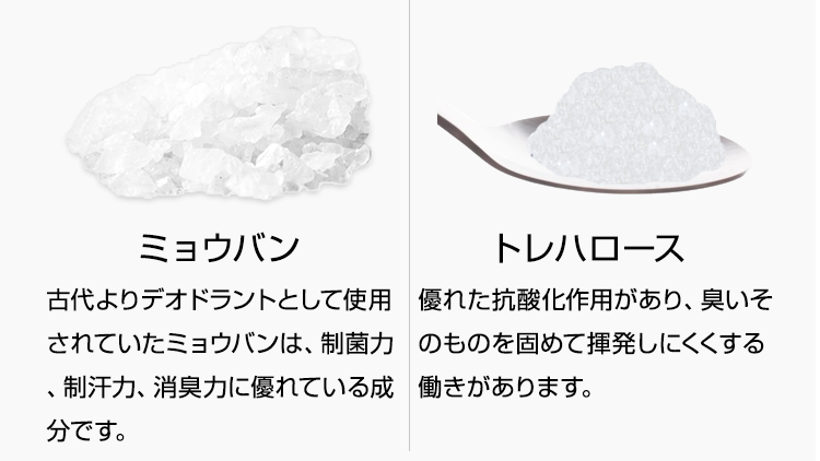 ミョウバンは安全性の試験項目を全て通過した不純物の無いものを使用。体臭の専門医との共同開発なので、一番効果のある濃度で配合。