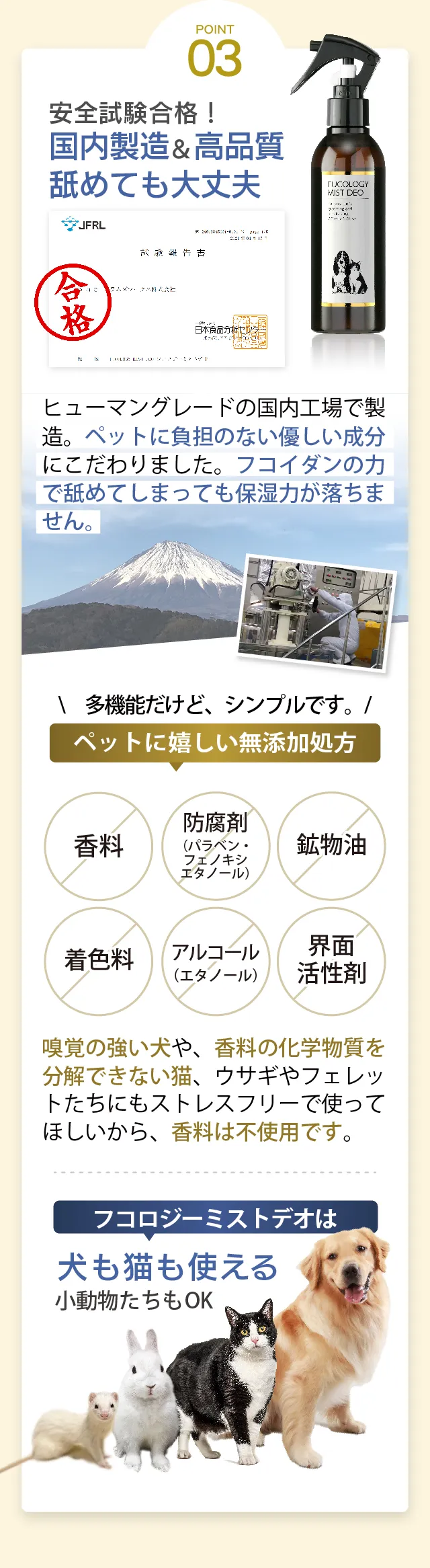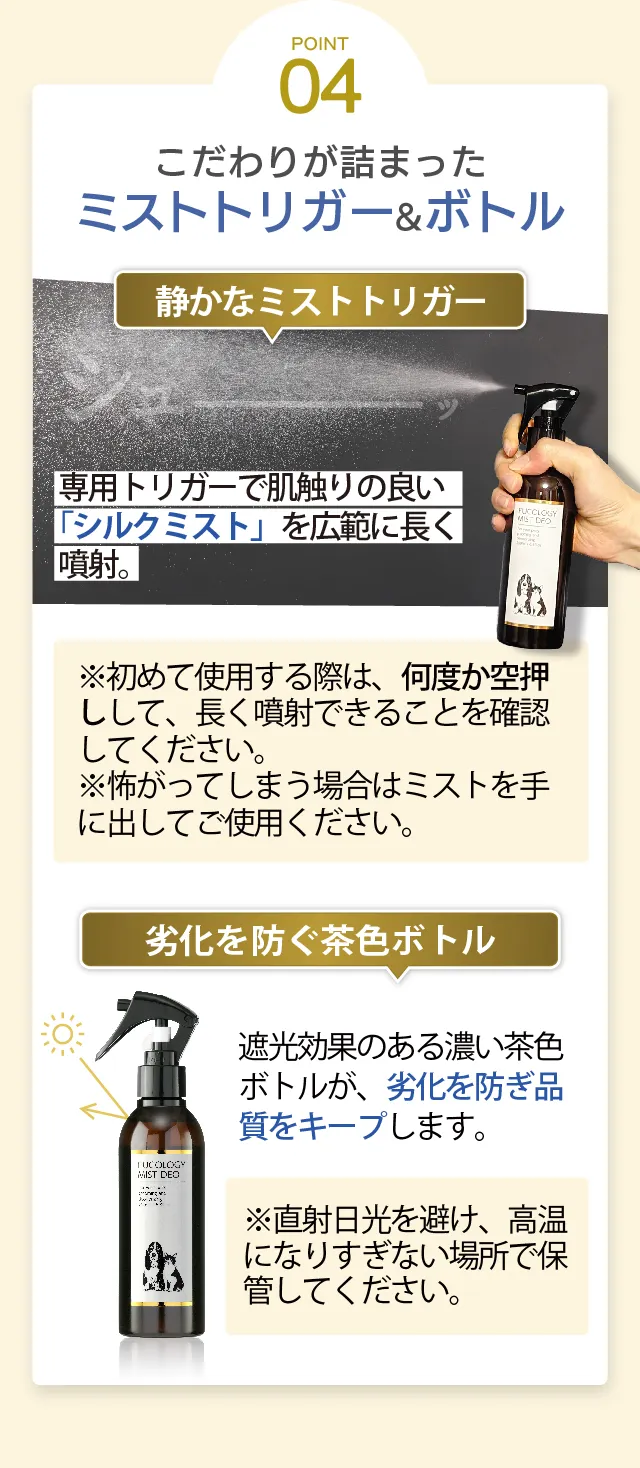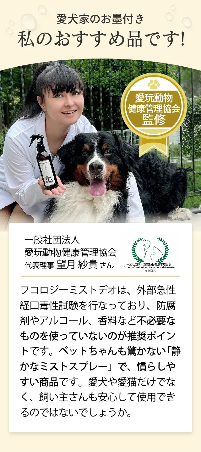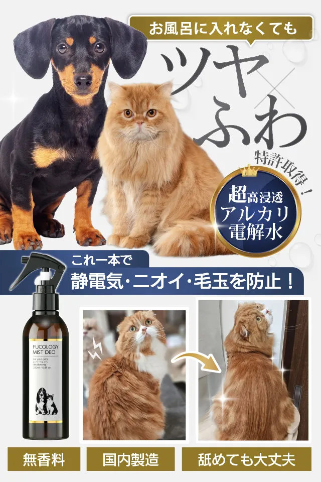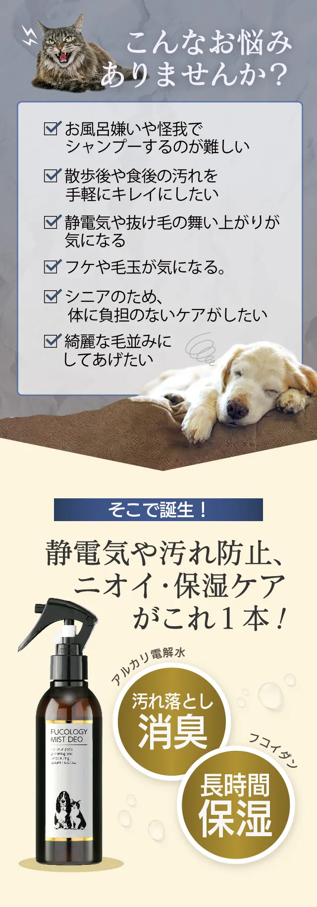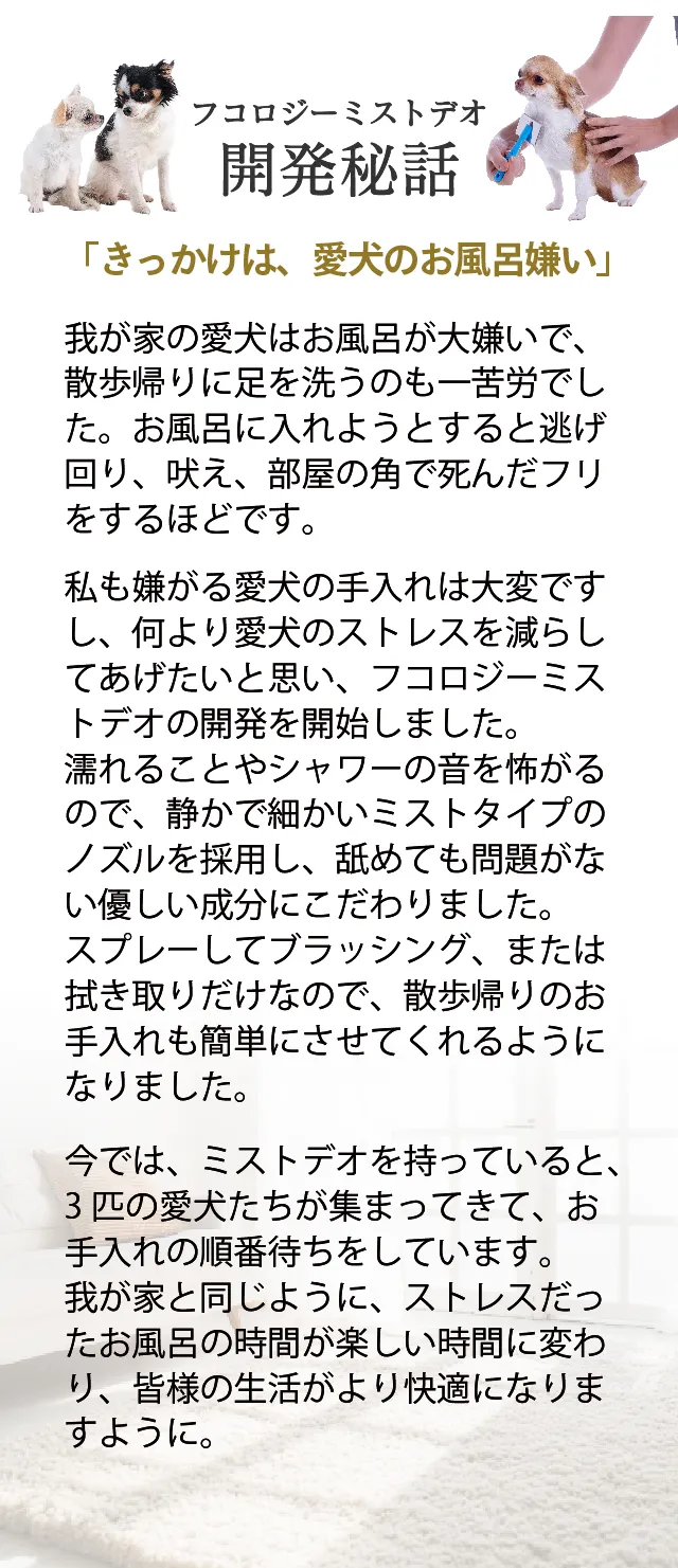 フコロジーミストデオは、お風呂嫌い、理由があってお風呂に入れない犬 猫 ペット用のグルーミング 静音スプレーです。