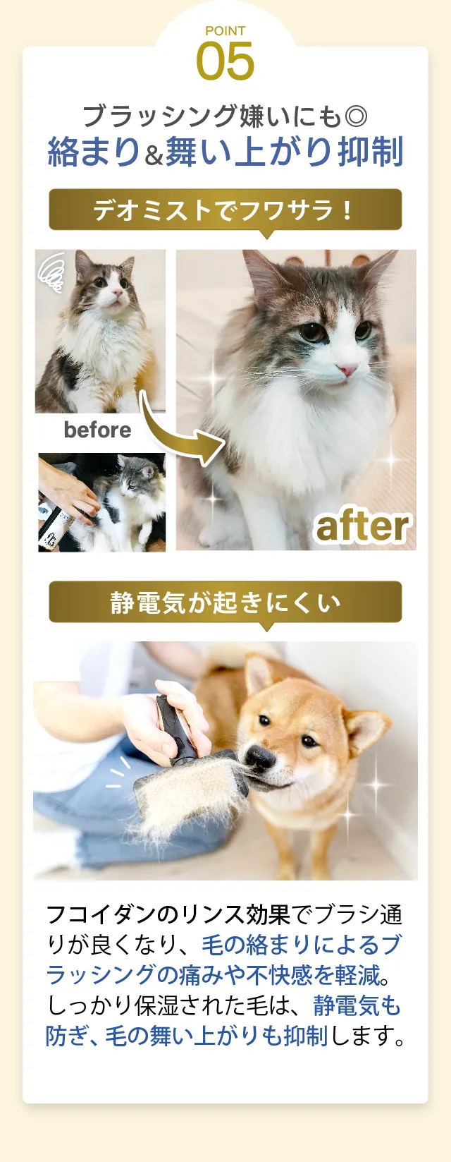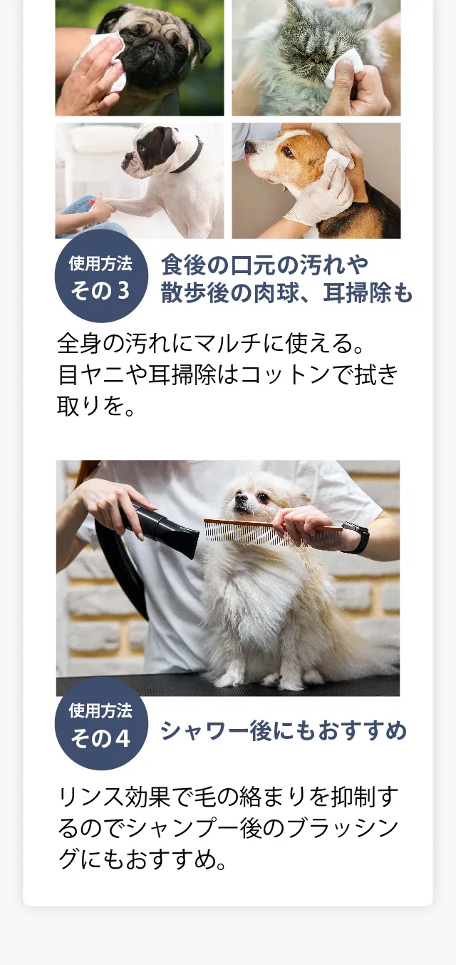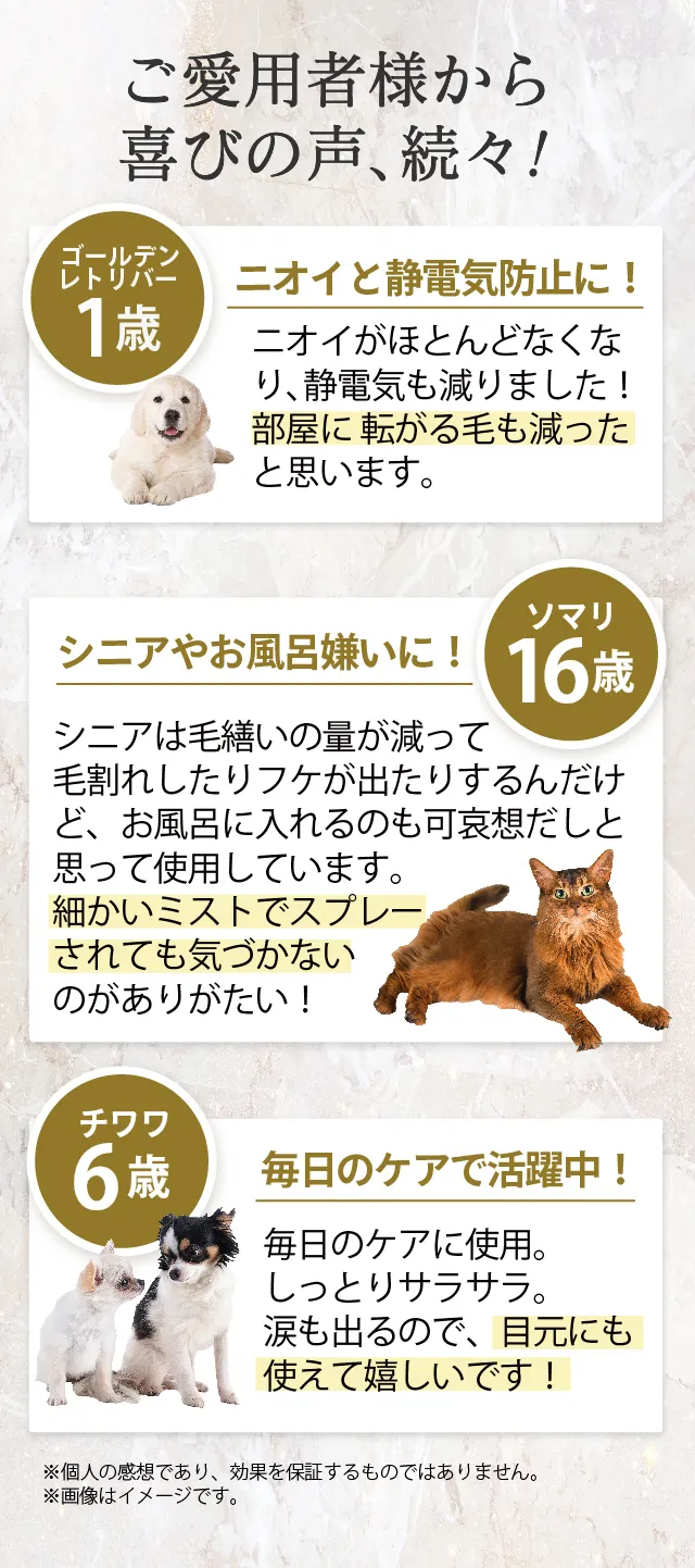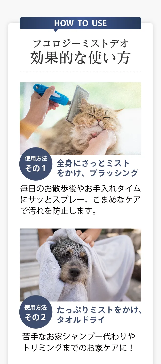 ブラッシング前に軽く全身にスプレーします。気になる臭いやパサつき、静電気を抑えて、健康的で艶やかな被毛に整えます。