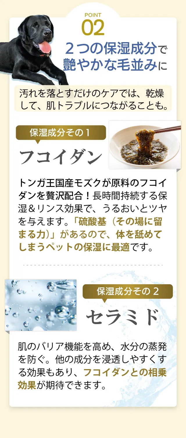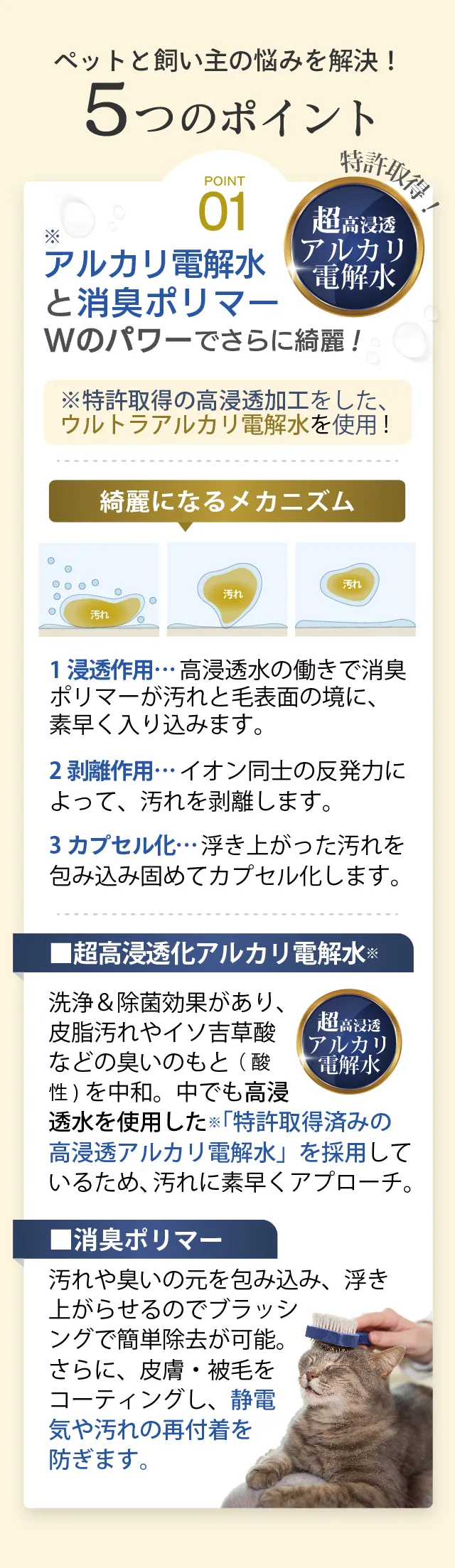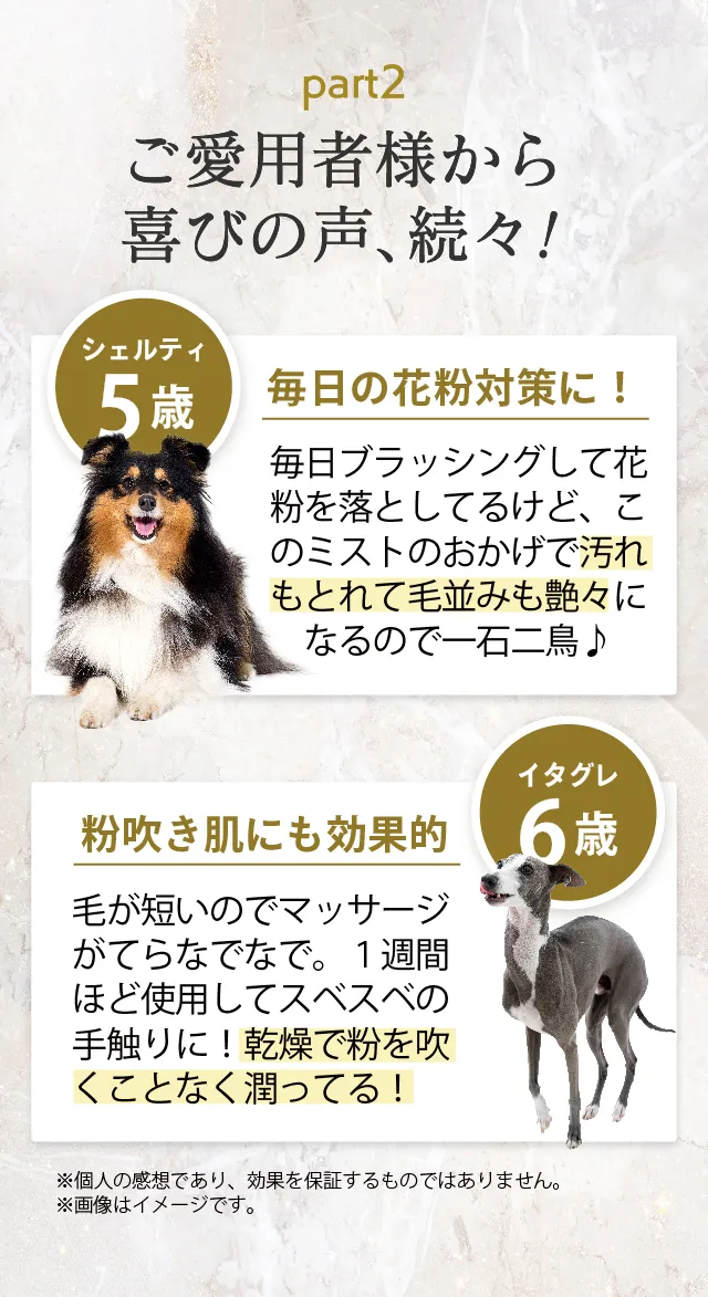 ブラッシング前に軽く全身にスプレーします。気になる臭いやパサつき、静電気を抑えて、健康的で艶やかな被毛に整えます。