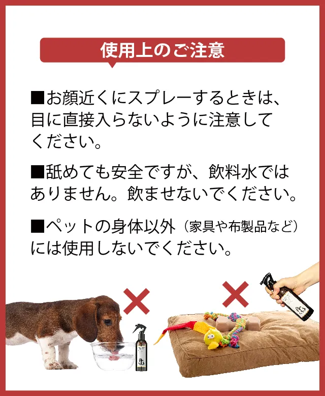 お顔の近くにスプレーするときは、目に直接入らないように注意してください。ペットが舐めたり口に入っても安全ですが、飲料品ではありませんので飲ませないでください。